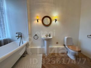 В роскошной ванной комнате на полу лиственница, смешанная изящно с плиткой. Латунные смесители и сама ванна на львиных лапках.