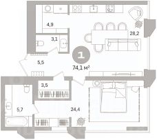 Однокомнатная квартира с предчистовой отделкой в ЖК "Гоголя 21" на 10 этаже. Общая площадь: 74.06 кв.м., жилая: 24.4 кв.м., площадь просторной кухни-столовой: 28.2 кв.м. Угловая квартира, идеально подойдет любителям тишины и панорамных видов. В квартире один совмещенный и один раздельный санузел. Высота потолков 2.98 м.