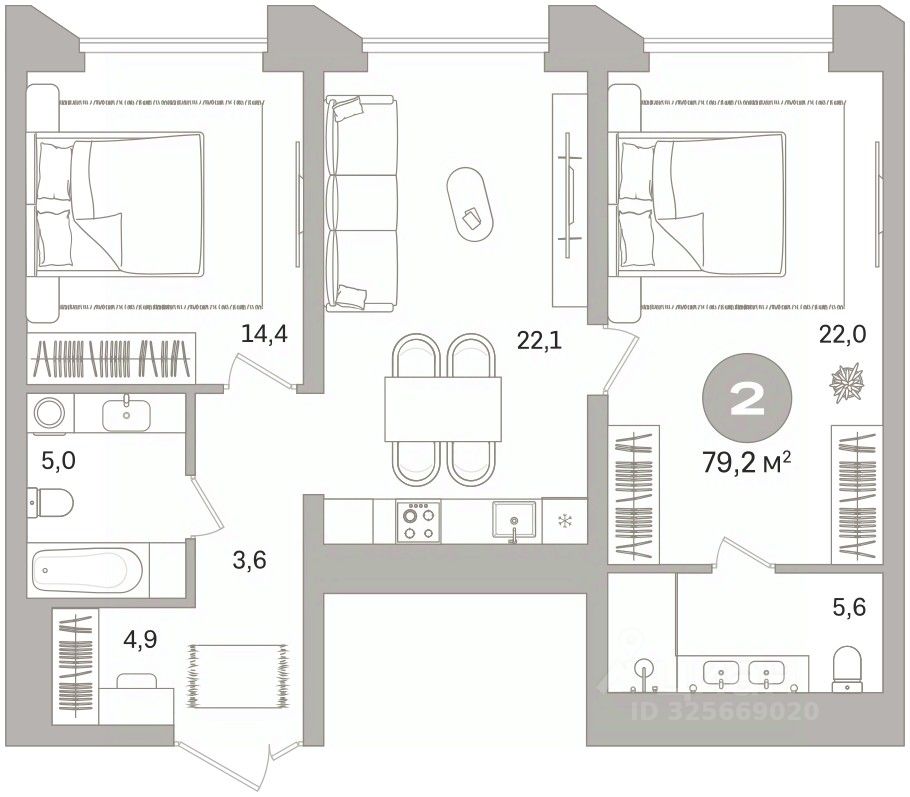 2-комн. квартира от застройщика с предчистовой отделкой в ЖК "Гоголя 21" на 7 этаже. Общая площадь: 79.2 кв.м., жилая: 36.4 кв.м., площадь просторной кухни-столовой: 22.1 кв.м. Комнаты изолированные, все окна выходят на одну сторону. В квартире два совмещенных санузла. Высота потолков 2.98 м.
