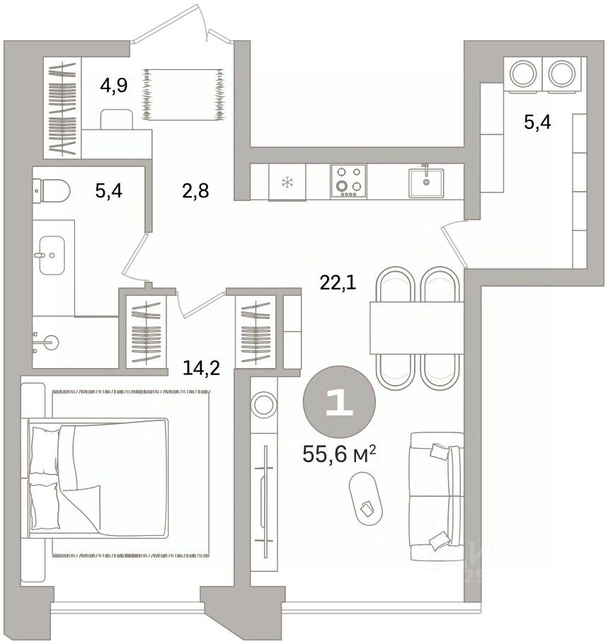 Однокомнатная квартира с предчистовой отделкой в ЖК "Гоголя 21" на 12 этаже. Общая площадь: 55.57 кв.м., жилая: 14.2 кв.м., площадь просторной кухни-столовой: 22.1 кв.м. Все окна выходят на одну сторону. В квартире один совмещенный санузел. Высота потолков 2.98 м.