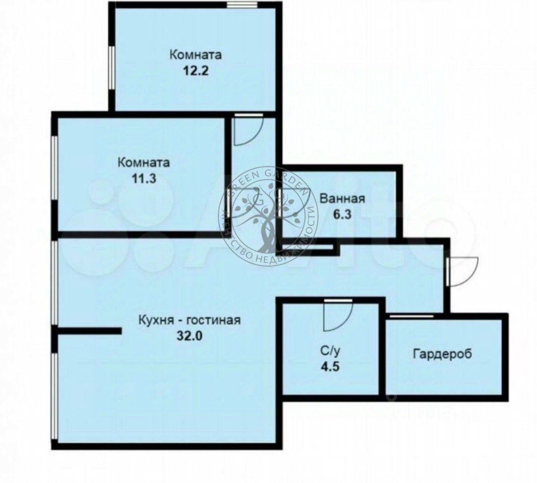 Простор и свет: Общая площадь 77.3 м с изолированными комнатами 11,3 м и 12,2 м.