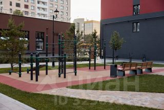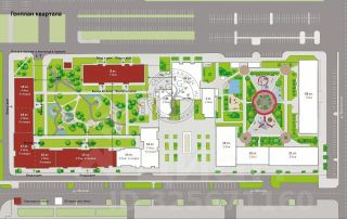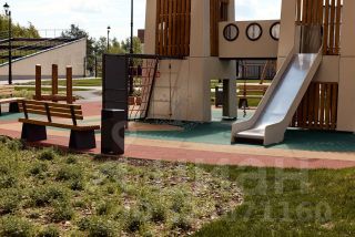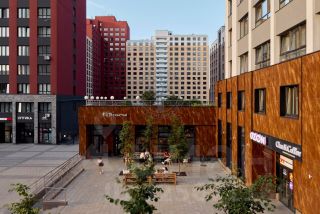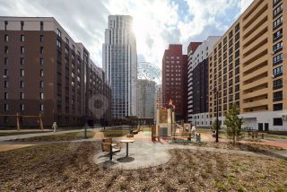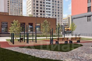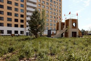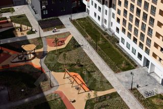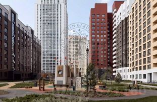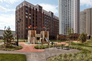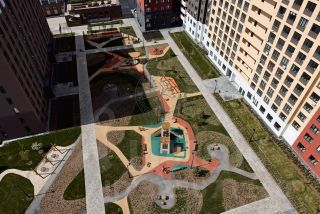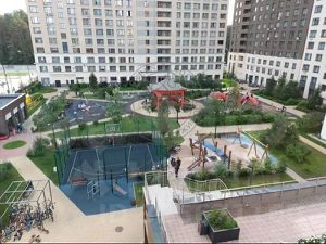 Благоустроенный двор: детские и спортивные площадки, зоны отдыха, фонтаны, терраса для жильцов.