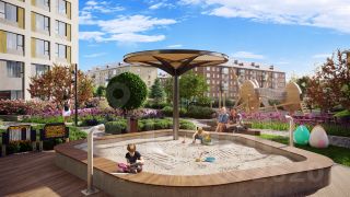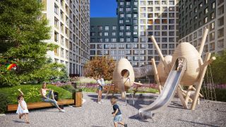 Двор без машин. Игровые площадки для детей разных возрастов, места отдыха и занятий спортом для взрослых не соседствуют с парковкой.