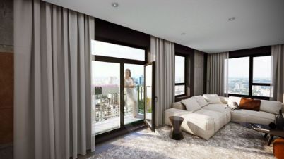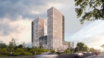 Современная архитектура. Долговечные фасады из навесных панелей и штукатурки, увеличенные окна и французские балконы формируют уникальный узнаваемый образ. Ночная подсветка выделяет дом среди застройки района и подчеркивает выразительность его силуэта.