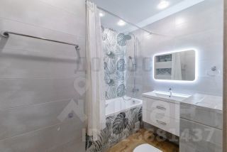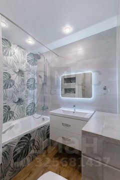 Ванная комната, выполненная в современном стиле, просторная, стильная раковина и зеркало с подсветкой. Раздельный сан узел, с качественным ремонтом.