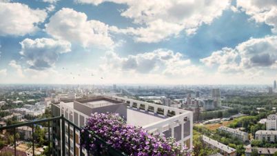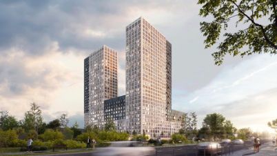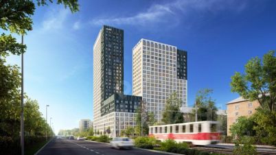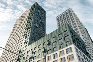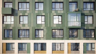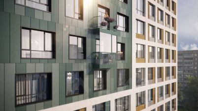 Современная архитектура. Долговечные фасады из навесных панелей и штукатурки, увеличенные окна и французские балконы формируют уникальный узнаваемый образ. Ночная подсветка выделяет дом среди застройки района и подчеркивает выразительность его силуэта.
