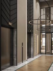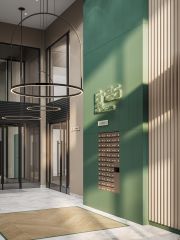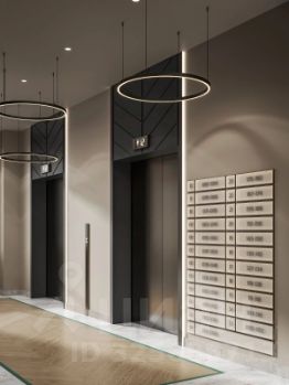 Дизайнерские холлы. Парадный холл с остеклением в пол, зонами ожидания, гостевым санузлом и санузлом для мытья лап животным, а также колес велосипедов и колясок.