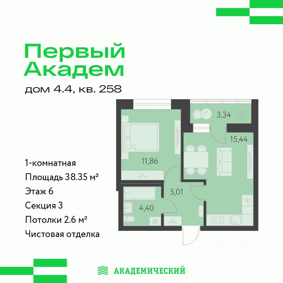 Продается 1-комнатная квартира площадью 38.35 кв.м. от девелопера "Академический" в жилом квартале "Первый Академ". Срок сдачи дома в 2028 году.
