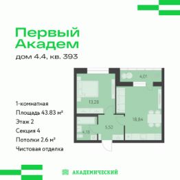 Продается 1-комнатная квартира площадью 43.83 кв.м. от девелопера "Академический" в жилом квартале "Первый Академ". Срок сдачи дома в 2028 году.