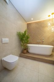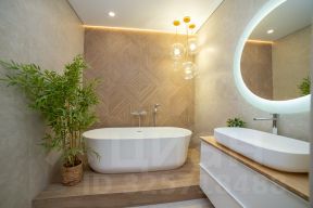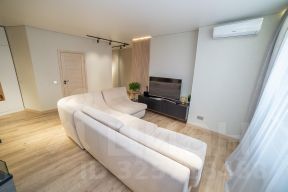 Уютная гостиная 25 кв.м., переходящая в комфортную кухню 20 кв.м. (техника - духовой шкаф, микроволновка, варочная поверхность, вытяжка Franke Швейцария, посудомойка Medea Китай, кондиционер Tosot Китай); два раздельных просторных санузла (по 6,5 кв.м.) - сантехника инсталляции Geberit, душ Hansgrohe, керамогранит Испания, душевая RGW Германия, ванная и умывальник Porcelanosa, Испания. Продуманная система хранения в гардеробной. Выделена зона для хозкомнаты. В квартире отличная шумоизоляция.