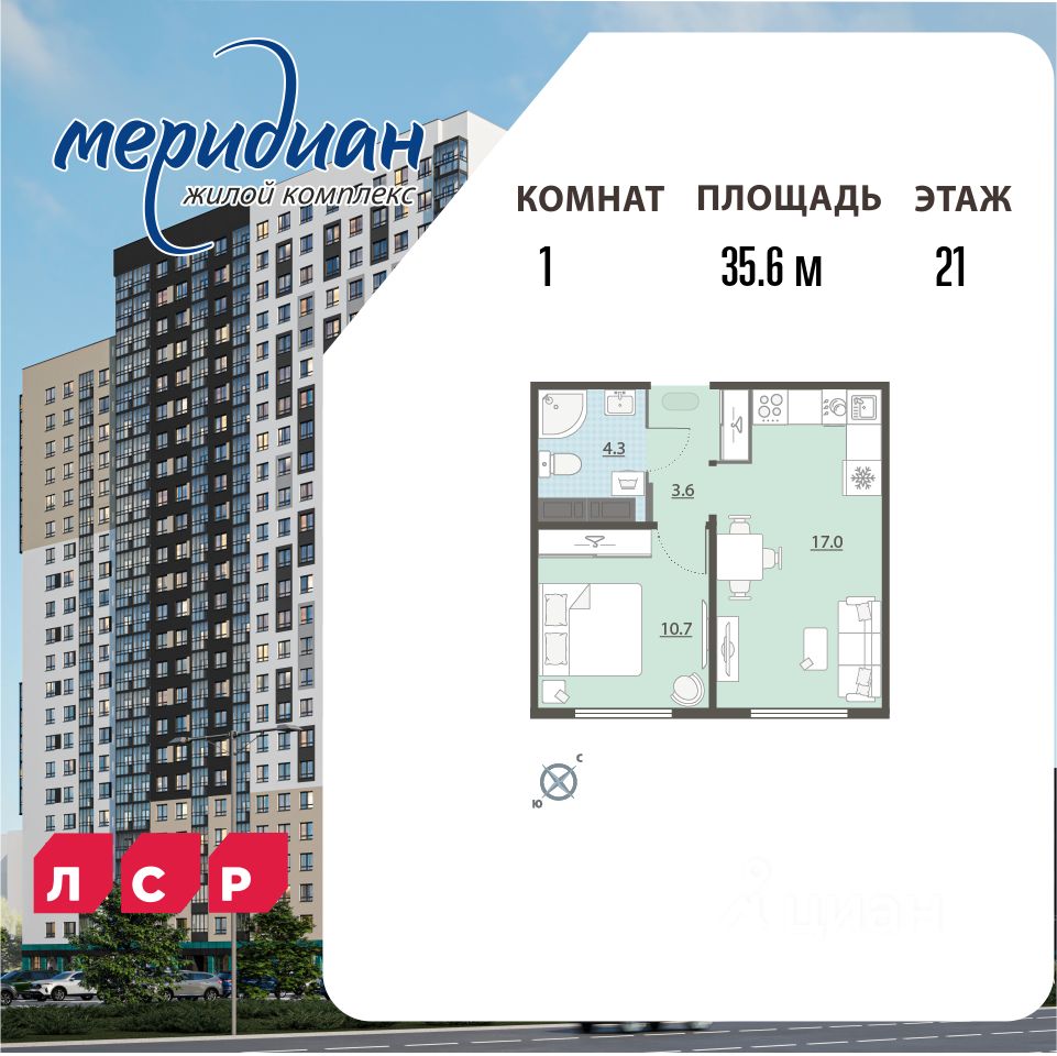Квартира располагается на 21 этаже 24-этажного дома в ЖК Меридиан.