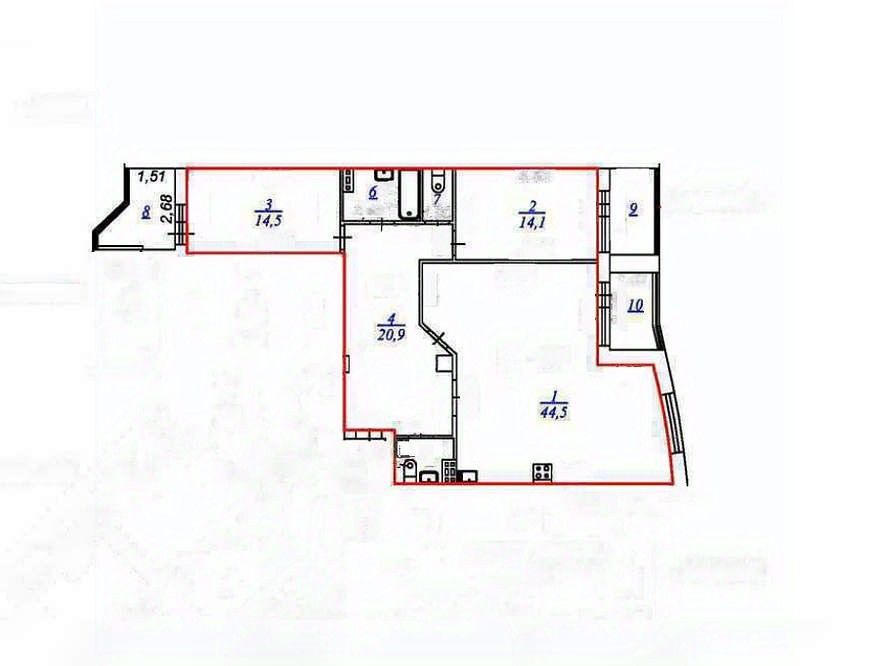 Элегантная эргономика пространства - квартира площадью 103,1 м включает просторную кухню-гостиную (44,7 м) , две изолированных спальни по 14,4 м каждая, два раздельных санузла, вместительную прихожую с возможностью организации встроенного гардероба, три светлые лоджии с великолепным видом.