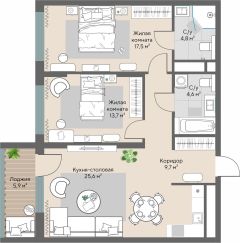 Продаётся 2-комнатная квартира в строящемся доме (Секции 1.4-1.6 (2 очередь)), срок сдачи: IV-кв. 2026, общей площадью 77.7 кв.м., на 17 этаже.
