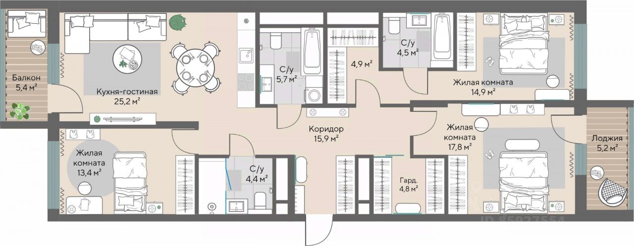 Продаётся 3-комнатная квартира в строящемся доме (Секции 1.4-1.6 (2 очередь)), срок сдачи: IV-кв. 2026, общей площадью 114.5 кв.м., на 17 этаже.