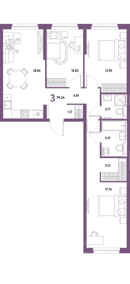 Продаётся 3-комнатная квартира в строящемся доме (Дом 3), срок сдачи: IV-кв. 2028, общей площадью 79.24 кв.м., на 9 этаже. Новый жилой комплекс "Уральский сад" от застройщика "ГК Страна Девелопмент" расположен по адресу: г. Екатеринбург, посёлок Совхозный, Комбинатская улица.
