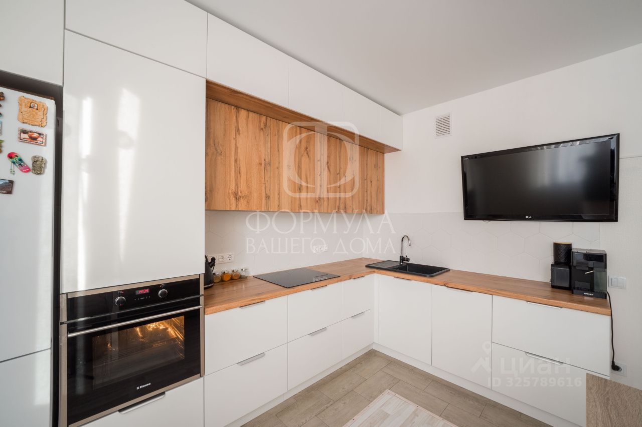 Кухня-гостиная 12,7 метров. На кухне качественный кухонный гарнитур, он остается новым владельцам, продуманы места хранения, ниши до потолка, качественная фурнитура, встроенная посудомойка, варочная поверхность, духовой шкаф, подсветка над рабочей зоной.
