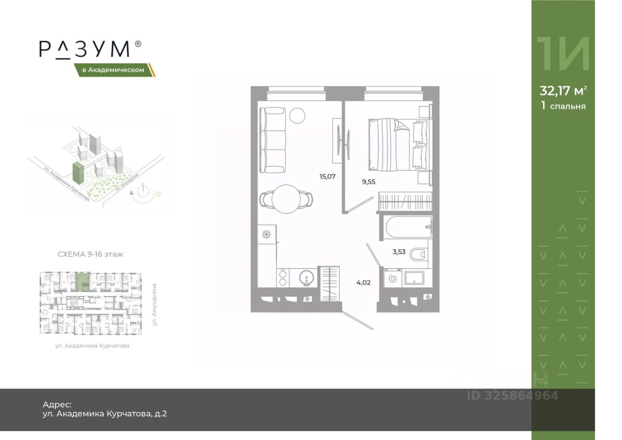 "РАЗУМ в Академическом" — это жилой комплекс из 7 домов переменной этажности от федерального девелопера "РАЗУМ" с 12-летним опытом создания жилых проектов. Дома от 12 до 24 этажей расположены в границах ул. Амундсена. В пешей доступности: - 6 школ; - 10 детских садов; - магазины; - поликлиники; - фитнес-залы. Рядом удобный выезд на ЕКАД. Главная особенность проекта — угловое остекление, которое составляет 22% всей площади. Окна в квартирах установлены в 60 см от пола. Увеличенная площадь остекления помогает снизить затраты на энергоресурсы и создаёт уют в квартире. Сердце жилого комплекса — приватный двор-парк с игровыми комплексами, тренажерами, площадками. "городские грядки" — новое решение благоустройства, где выращиваются ароматные травы или цветы. За пределами комплекса есть прогулочная зона с эко-тропой с вдохновляющими надписями. Прогулки по эко-тропе — это променады наедине с природой. "РАЗУМ в Академическом" — это: - территория без машин; - безбарьерная среда; - единый экостиль в оформлении дворового пространства; - 11 тематических зоны в двор-парке; - многоуровневое освещение и подсветка фасадов; - видеонаблюдение; - гостевой паркинг; - эстетичные подъездные холлы со сквозными подъездами и комфортной зоной ожидания; - Разделенные колясочные и велосипедные зоны; - Велосипедные на 1 этаже; - Кладовые помещения на каждом этаже и на -1 этаже. В проекте 25 планировочных решений: от уютных студий от 21,51 м² до квартир с тремя спальнями и кухней-гостиной до 66,58 м² с функциональным разделением на гостевую и приватные зоны.