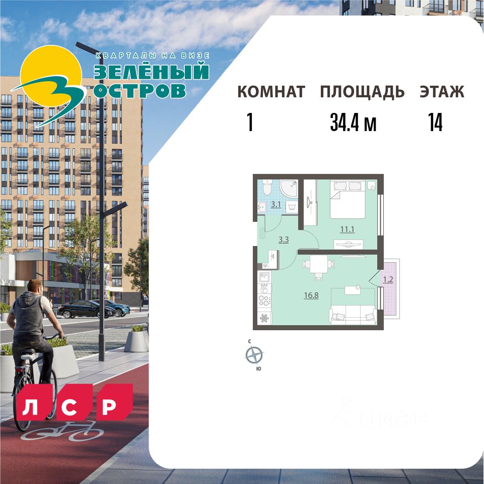 Квартира располагается на 14 этаже 16-этажного дома в ЖК Зеленый остров.