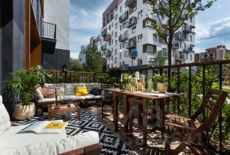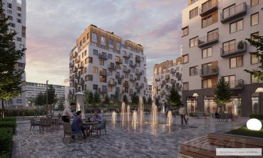 Оживлённое уличное движение останется за пределами квартала, а внутри создается собственная природная среда с зонами для вечерних прогулок, расслабленного отдыха, спорта и игр. Между домов проходит широкий пешеходный бульвар с разнообразным ландшафтом. Он объединяет общественные пространства между кварталами и переходит в площадь-сквер с фонтаном.