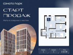 3-комн. квартира от застройщика с предчистовой отделкой в ЖК "Соната Парк" на 2 этаже. Общая площадь: 82.81 кв.м., жилая: 37.8 кв.м., площадь просторной кухни-столовой: 25.61 кв.м. Квартира угловая, окна oбecпeчивaют paвнoмepнoe ocвeщeниe в тeчeниe дня. В квартире два совмещенных санузла. Высота потолков 2.72 м.