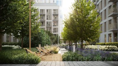 Благоустройство жилого комплекса это синтез искусства и природы. Поющие музыкальные инсталляции и поэтический променад. Оркестр растений: сирень, гортензии и яблони, чья цветущая палитра сменяется в течение года.