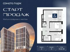 2-комн. квартира с предчистовой отделкой в ЖК "Соната Парк" на 3 этаже. Общая площадь: 55.57 кв.м., жилая: 22.17 кв.м., площадь просторной кухни-столовой: 17.74 кв.м. Комнаты изолированные, все окна выходят на одну сторону. В квартире одна лоджия, один совмещенный санузел. Высота потолков 2.72 м.