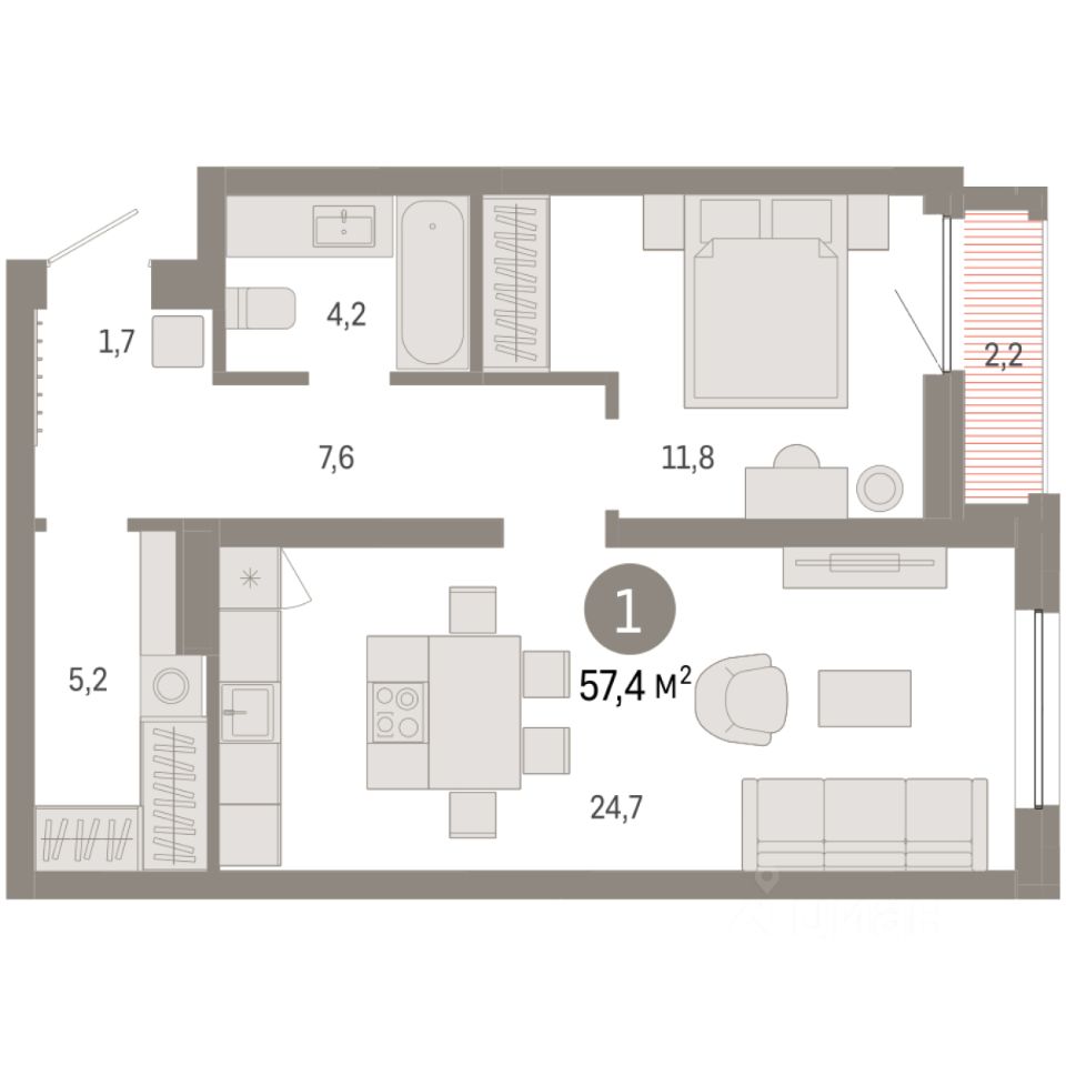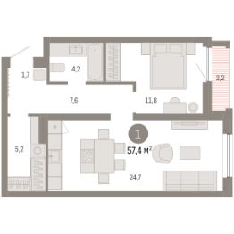 Квартира с кухней-гостиной и одной спальней в Южных кварталах. Особенности планировки: предчистовая отделка.