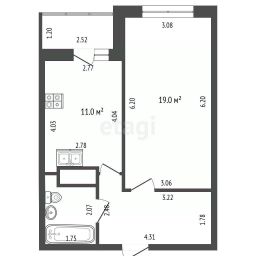 О квартире: В квартире изолированная планировка, комната площадью 19 м2, кухня 11 м2, оборудованная гардеробная комната 3м2, балкон 3м2. С/у совмещен.