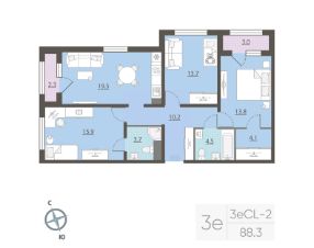 Жилая площадь 43.6 м2, кухня 19.5 м2, отделка под ключ. Раздельных санузлов - нет, балконов - нет, лоджий - 1.