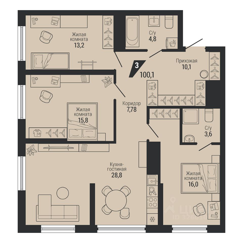 Планировки начинаются от 32 м² и доходят до 159,5 м². Всего 32 вида планировок. На этажах располагается от восьми квартир классического и евроформата от студия до пятикомнатных. Застройщик предлагает два вида отделки: white box и чистовую. Есть возможность перепланировки.