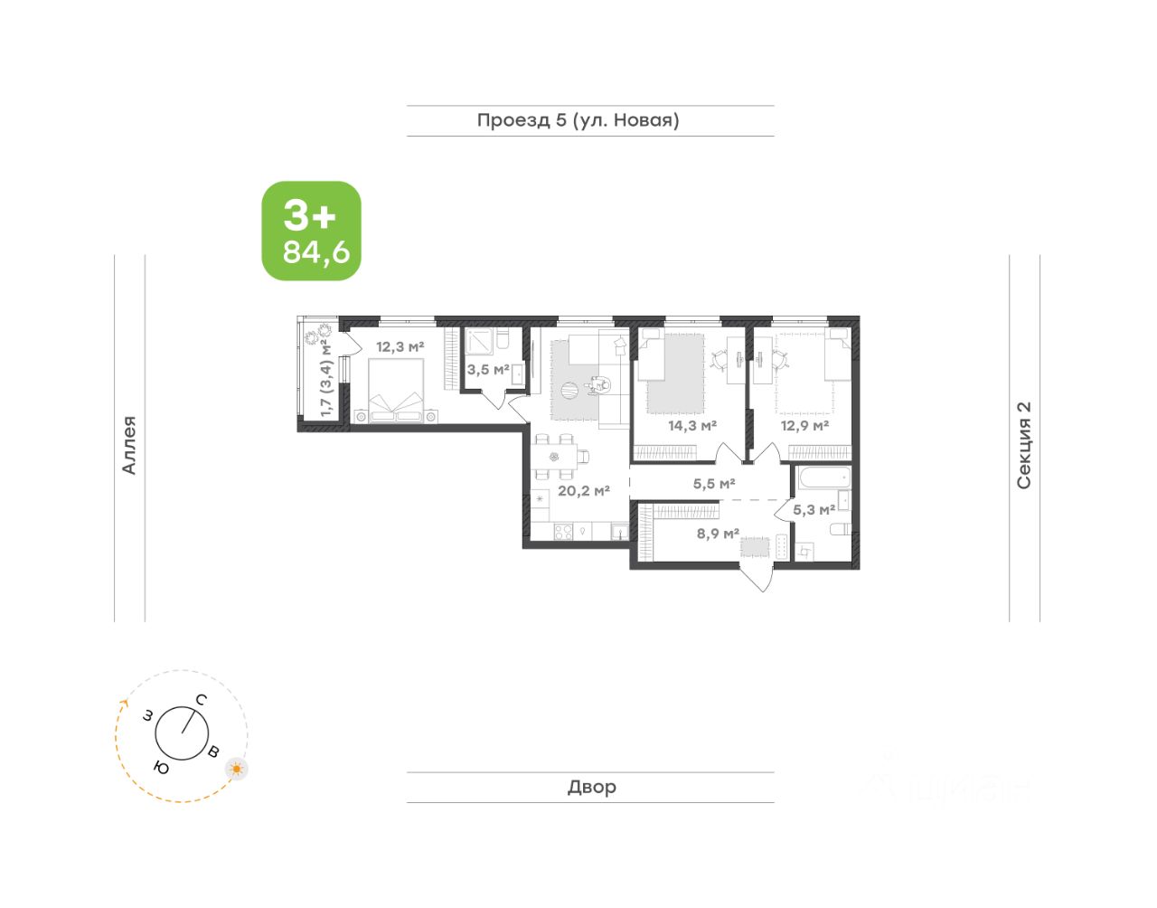 Две спальни 14,3 м² и 12,9 м² подойдут для детей, гостей или рабочего кабинета. Светлые, просторные и уютные — они легко адаптируются под любые задачи