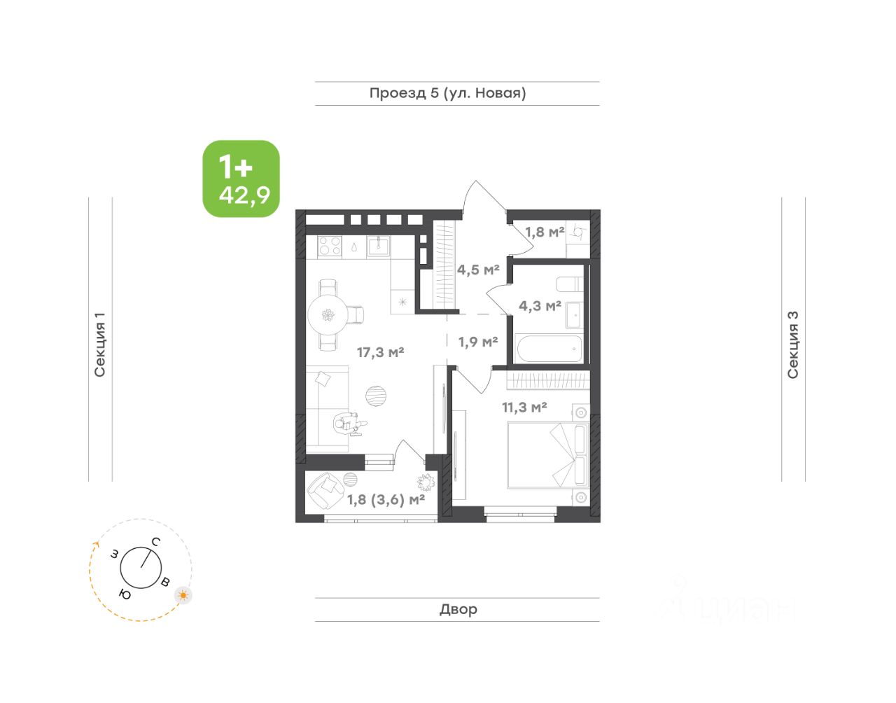Кухня-гостиная 17,3 м² с выходом на лоджию — сердце квартиры, наполненное светом и уютом. Здесь удобно готовить, принимать гостей или отдыхать после долгого дня