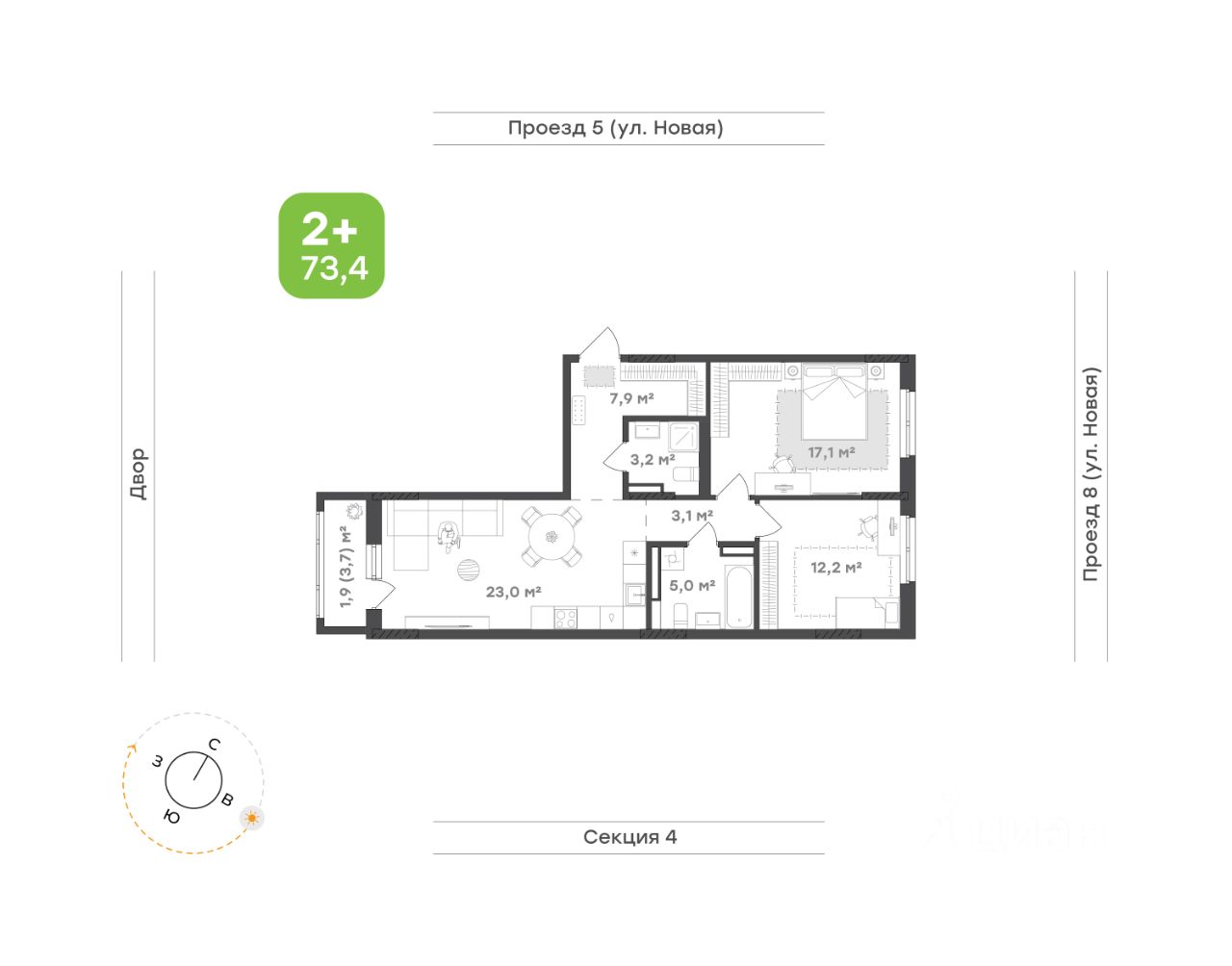 Кухня-гостиная — 23,0 м² свободы для встреч с друзьями, семейных ужинов и уютных вечеров. Пространство легко зонируется: обеденная зона плавно перетекает в зону отдыха, где можно расположить комфортный диван и медиазону. За прилив свежего воздуха отвечает лоджия с 3,7 м² личного пространства с видом на тихий двор