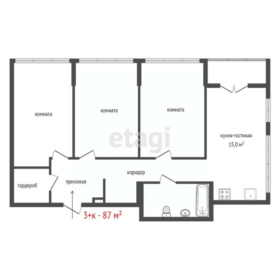 Идеальная планировка квартиры: Кухня 15 метров, детская и спальня по 15 метров, гостиная 17 метров, все комнаты правильной формы, предусмотрено 2 сан узла, но один переделан под гардеробную, теплая светлая лоджия. Окна выходят на разные стороны света.