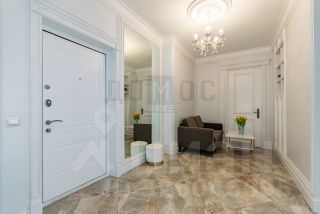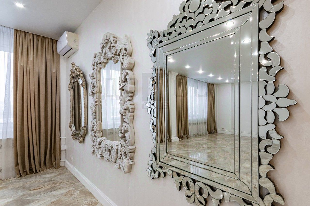 Встроенные шкафы в потолок из массива дерева - белая эмаль, зеркала под проект в пол, молдинги orac decor. Остаются: кухонный гарнитур, оборудованная гардеробная комната, корпусная мебель, дорогой текстиль, выполненный на заказ, освещение.