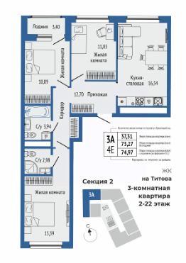 Продаётся 3-комнатная квартира в строящемся доме (Секции 1,2), срок сдачи: I-кв. 2027, общей площадью 76.19 кв.м., на 20 этаже. Новый жилой комплекс "Квартал на Титова" от застройщика "Правобережный" расположен по адресу: г. Екатеринбург, улица Титова.