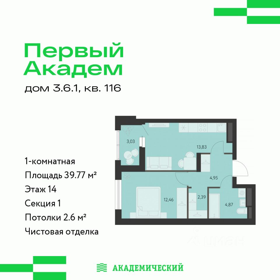 Продается 1-комнатная квартира площадью 39.77 кв.м. от девелопера "Академический" в жилом квартале "Первый Академ". Срок сдачи дома в 2026 году. Выгоды и скидка напрямую от застройщика.