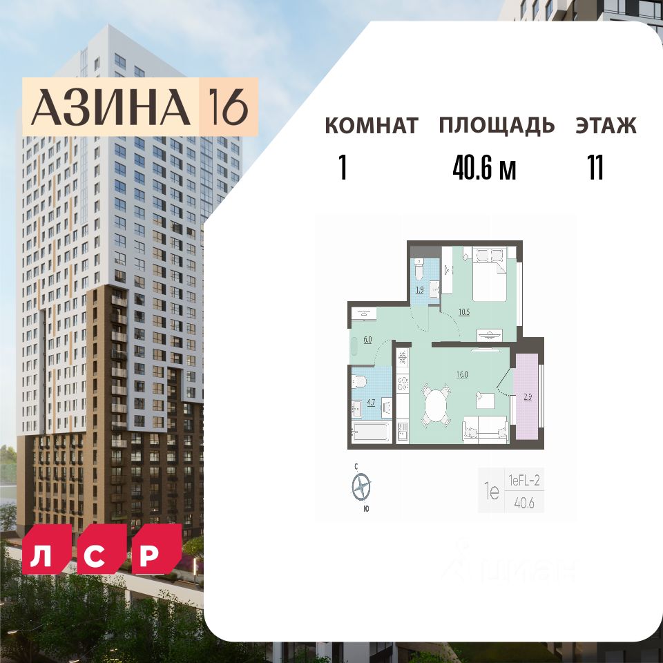 Квартира располагается на 11 этаже 25-этажного дома в ЖК Азина, 16.