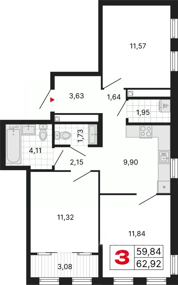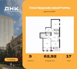 3-комн. квартира с предчистовой отделкой в ЖК "ДНК. Дом на Куйбышева" на 17 этаже. Общая площадь: 62.92 кв.м., жилая: 34.73 кв.м., площадь просторной кухни-столовой: 9.9 кв.м. Квартира угловая, очень светлая, естественная вентиляция при открытии окон. В квартире одна лоджия, один совмещенный и один раздельный санузел. Высота потолков 2.7 м.