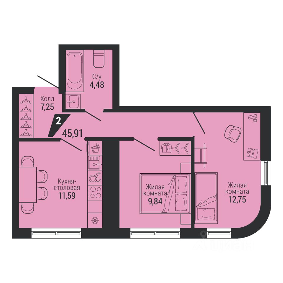 Общая площадь45,91 м²