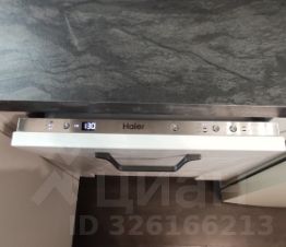 В квартире остается кухонный гарнитур фабрики "Мария", варочная поверхность Hotpoint-Ariston , посудомоечная машина Haier и вытяжка Krona.