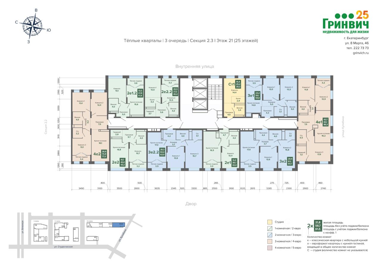 Современный семейный ЖК "Теплые кварталы" - новый жилой комплекс повышенной комфортности на границе Втузгородка и Пионерского района (перекресток ул. Блюхера/Студенческая). Теплые кварталы для тех, кто думаете о комфорте своем и близких. Срок сдачи дом 2 (3 очередь) - 2026 год. Материнский капитал при покупке использовать можно. Теплые кварталы - квартальная застройка переменной этажности (от 7 до 25).Комплекс будет состоять из 5 очередей. В продаже 3 очередь, дом 2 - переменной этажности. Строительство уже ведется. Преимущества комплекса: - Качественная чистовая отделка позволит сразу заехать в новую квартиру, взять паузу для накопления средств на ремонт или сдать жилье в аренду без дополнительных капитальных вложений.- Собственная котельная горячая вода и отопление в любое время года по потребности жильцов!Зеленый двор без машин!- Дворы очередей соединены сквозными проходами создается единое пространство. Шумные и тихие зоны отделены друг от друга. Уютная и камерная атмосфера двора напоминает отдых за городом. Вдали от шумных улиц мегаполиса.- Подземный паркинг с лифтом до жилого этажа. - Кладовые на "-1" этаже.- Безбарьерная среда на всей территории комплекса- Одни из лучших школ города по прописке: Гимназии 43, 47 и 108; Лицей 130 Окружение: - Рядом три топовых ВУЗа: Гуманитарный Университет, Юридический Университет, УрФУ, а также СУНЦ УрФУ;- Близость озера Шарташ, Основинского парка и Дендрария располагают к ежедневным прогулкам;- Рядом с кварталом расположен ЦК Урал, где все виды спортивного и творческого развития: бассейн, футбольное поле, кружки, секции для детей и взрослых- Поблизости ТРЦ Парк Хаус и Апельсин: кинотеатр, фитнес-центр, рестораны и популярные магазины.- У дома остановки трамвая и автобуса. - Для автомобилистов - удобный выезд как в центр, так и на объездную дорогу. О доме: - Механическая вентиляция - круглогодичная бесперебойная работа вентиляции!- Дизайнерская отделка холлаКолясочная в холле- Эргономичные планировки с максимальным полезным пространством: квартиры с мастер-спальнями; удобное зонированием на кухню и гостевую зону в кухне-гостиной; ниши для шкаф-купе и гардеробные в прихожих; окна на 2 и 3 стороны в многокомнатных квартирах- Качественная чистовая отделка: Ламинат 32 класса, обои под покраску, потолок обои, балконная дверь с остеклением, санузлы - умывальник со смесителем, унитаз. Счетчики на э/э, воду и тепло ежемесячная экономия на коммунальных платежах;- Горизонтальная разводка систем отопления свободные стены.