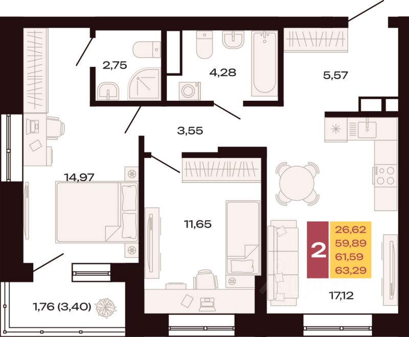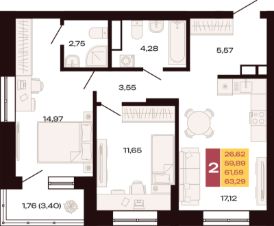 Продаётся 2-комнатная квартира в строящемся доме (Секция 1.1), срок сдачи: II-кв. 2027, общей площадью 63.29 кв.м., на 7 этаже. Новый жилой комплекс "Первый южный" от застройщика "Проспект Групп" расположен по адресу: г. Екатеринбург, улица Амундсена.