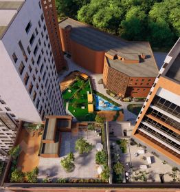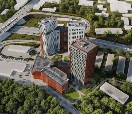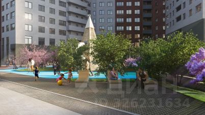 Зеленый двор с мультивозрастными детскими площадками, воркаут и лаунж-зона для отдыха и прогулок.