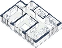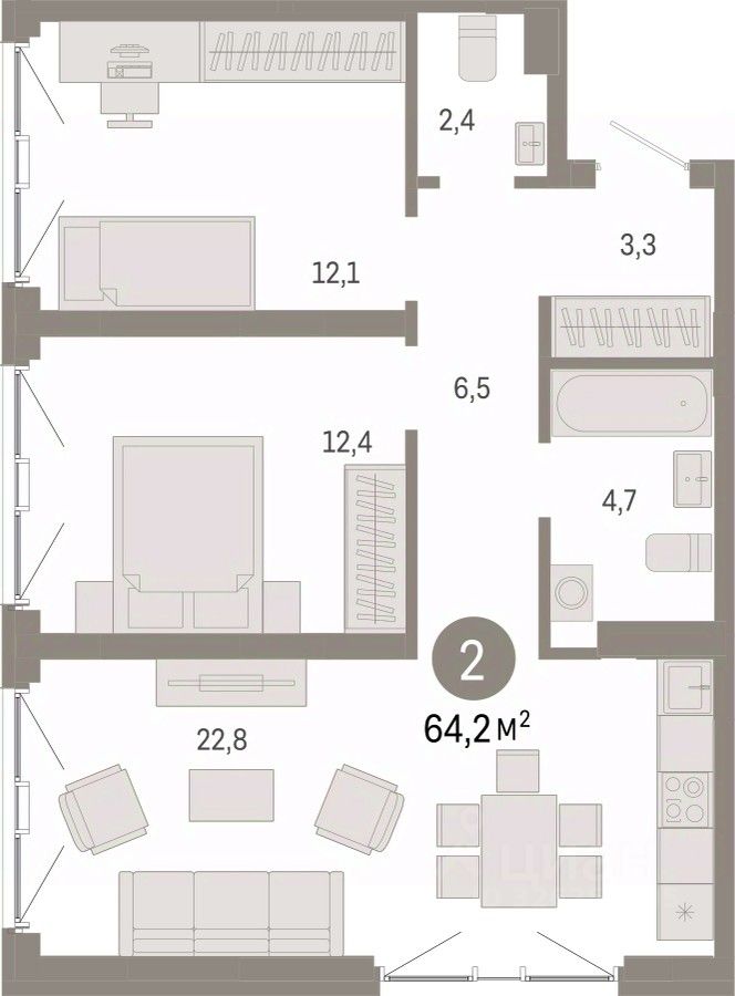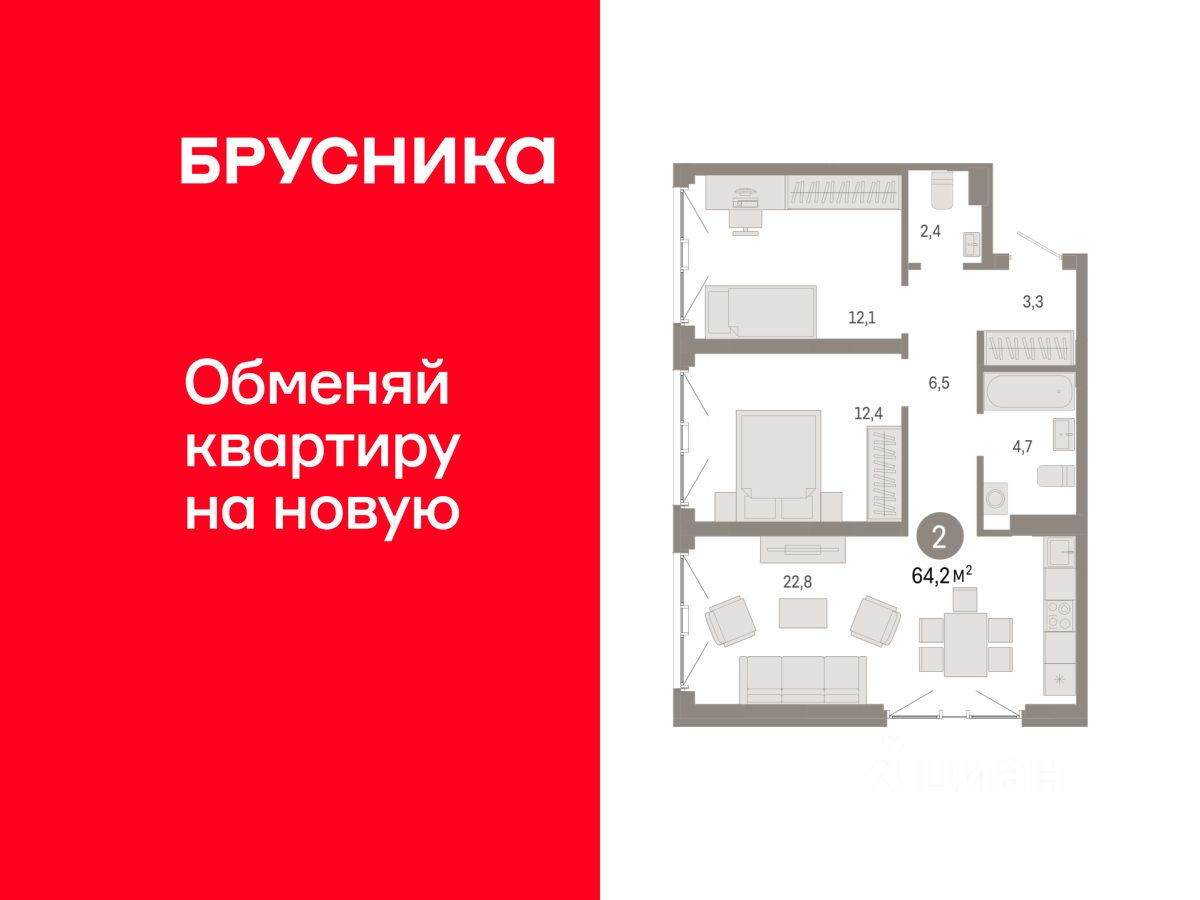 Квартира с кухней-гостиной и двумя спальнями в районе Шишимская горка. Особенности планировки: вид во двор, второй санузел, окна в пол, панорамное остекление, потолки 3 м и выше, предчистовая отделка.