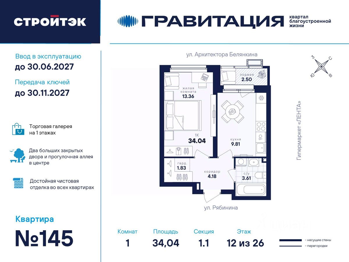 Удачные решения Новый квартал благоустроенной жизни "Гравитация" мы разместили в периметре улиц Рябинина и Академика Ландау. У квартала 5 этапов строительства, а всю работу мы завершим к 2030 году. Авторы проекта гармонично совместили в оформлении природные элементы и современный дизайн. Волнообразные очертания на стенах вдохновлены силой ветра и движением воды. Скруглённые углы подчеркивают элегантный силуэт, а контрастная палитра акцентов и контурная подсветка верхних этажей создают выразительный архитектурный образ. Первый этап строительства: — Секция 1.1 — 1 подъезд 26 этажей — Секция 1.2 — 2 подъезда 16 этажей — Секция 1.3 — 1 подъезд 12 этажей Здесь всё и сразу Гравитация — уютный и обособленный, и в то же время открытый и просторный квартал. Всё рядом: супермаркеты и парки, кино и рестораны, школы и сады. В нескольких шагах набережная реки Патрушихи. В квартале построят муниципальный детский сад на 200 мест, а на 5 этапе строительства мы возведём 6-уровневый надземный паркинг на 250 машин. На первых этажах домов для вас будет работать торговая галерея с магазинами, кафе и привычными бытовыми сервисами. В 1 этапе строительства 631 квартира. Своя вселенная Развитый Академический район удобен и молодым семьям, и школьникам, и состоявшимся профессионалам. Рядом большой Преображенский парк с озером и Юго-Западный лесопарк с Тропой здоровья. — 3 минуты до Гипер Ленты — 10 минут на машине до ТРЦ "Академический", 15 минут до ЕКАД, 25 до центра — 6 школ и 6 детских садов — Спортивные комплексы и клубы Wake up, Bright Fit и Юность Богатые возможности В квартале два просторных закрытых двора общей площадью 1,4 гектара. Один двор объединяет 1 и 2 этапы строительства, другой — 3, 4 и 5 этапы. Между дворами — камерная прогулочная аллея для неспешных вечеров или полуденного отдыха. Во дворе первого этапа — зелёные участки из хвойных деревьев, акцентных кустарников и травянистых многолетников, а также сеть дорожек, детская площадка с песочницей, аттракционами и геопластикой, настольный теннис и зона для зарядки. А для комфорта и безопасности — вечернее освещение, охрана и постоянное видеонаблюдение. Пространство с заботой В просторных светлых лобби Гравитации — интеллигентный дизайн, помещения для колясок, высокие витражи и комфортная мебель. Выходы сквозные, на улицу и во двор. Лифты грузоподъёмностью 1000 и 450 кг. Мы подготовили для вас 44 уникальных варианта продуманных планировок, в том числе с кухнями-гостиными, гардеробными и мастер-спальнями. Здесь нет бесполезных зон, зато есть где посидеть в семейном кругу и разместить всё для удобства и комфорта. Современные технологии Мы позаботились о достойной чистовой отделке, чтобы вы могли уделить время главному. — Виниловые обои на флизелиновой основе, окрашенные стены в санузлах и на лоджиях — Натяжные потолки везде, кроме лоджий, там — окрашенные — Прочный влагостойкий ламинат и керамическая плитка — Межкомнатные двери светлых тонов и сейф-дверь на входе — Эргономичное размещение розеток и выключателей