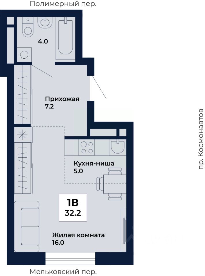Продаётся студия в строящемся доме (Дом 8,9), срок сдачи: I-кв. 2029, общей площадью 32.2 кв.м., на 5 этаже. ЖК "Космос" - современный жилой квартал на проспекте Космонавтов 7, который строит ГК "Ривьера Инвест Екатеринбург". Жилой комплекс - это пять домов, благоустроенная территория комплекса и наземная парковка. Места общего пользования также выполнены в единой стилистике "космической" темы, используемой и в оформлении холлов, и дворов.