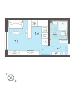 Жилая площадь 7.9 м2, кухня 5.6 м2, чистовая отделка. Раздельных санузлов - нет, балконов - нет, лоджий - нет.