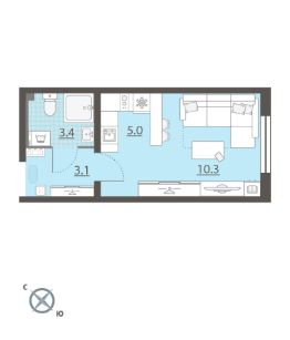 Жилая площадь 10.3 м2, кухня 5 м2, чистовая отделка. Раздельных санузлов - нет, балконов - нет, лоджий - нет.