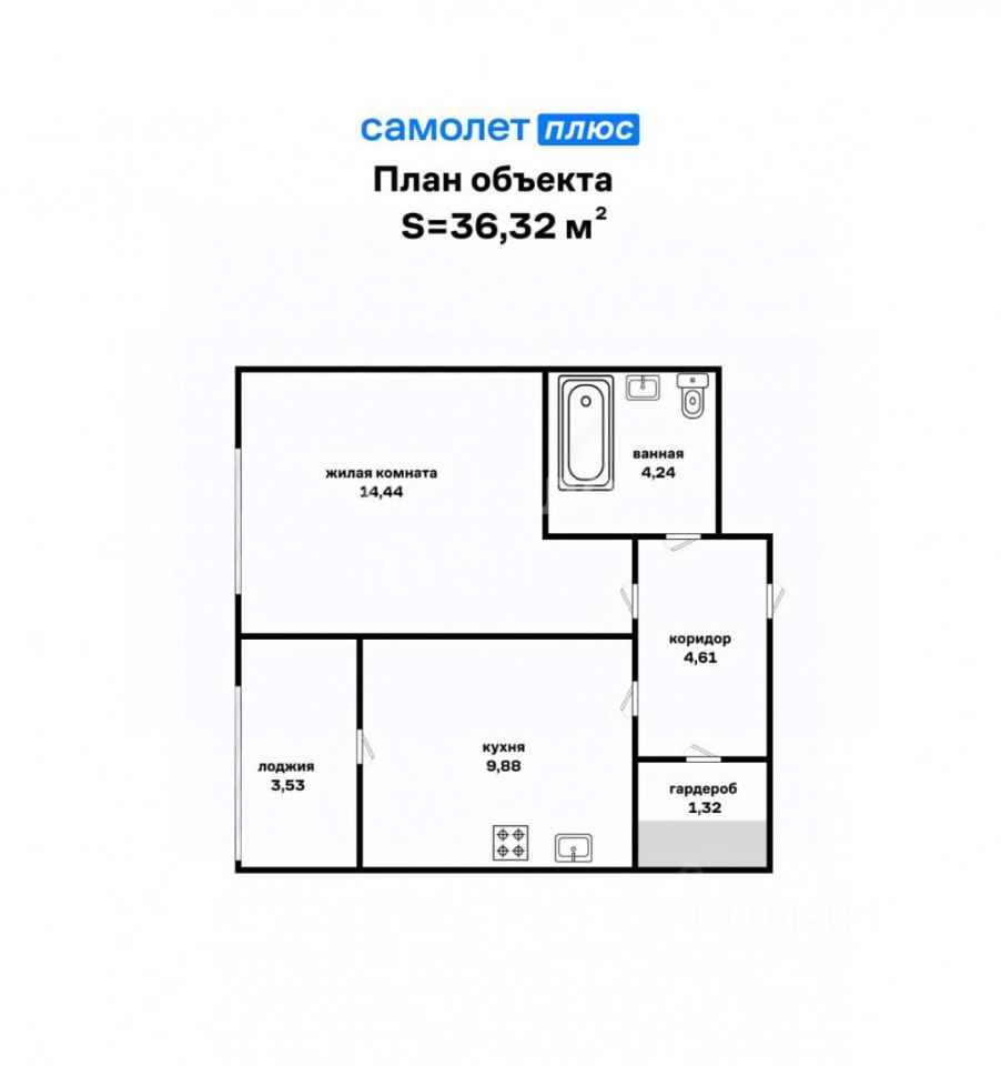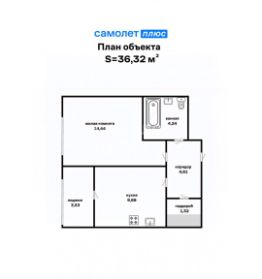 Общая площадь: 35,1 кв.м (36,9 кв. м с учетом просторной лоджии).